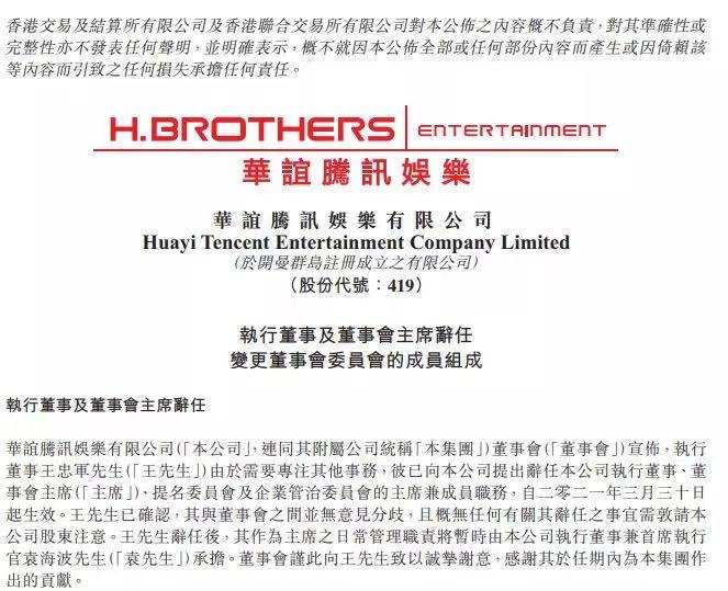 如果不是因为王中军的辞任,很少有人能够记得华谊腾讯娱乐这家公司。