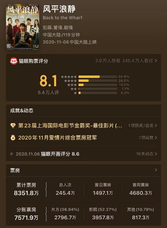 但是也有影院经理认为,如今的中国电影市场是“脉冲消费市场”。“现在的00后观众,普遍没有上一代人有电影情怀,像《悬崖之上》这样的片子虽然好,但他们会觉得没有那么爽。”某影院经理向小娱吐槽,“他们每天都安排了很多节目,但随时可能变化,突然不看了,或者立刻就要看到。”