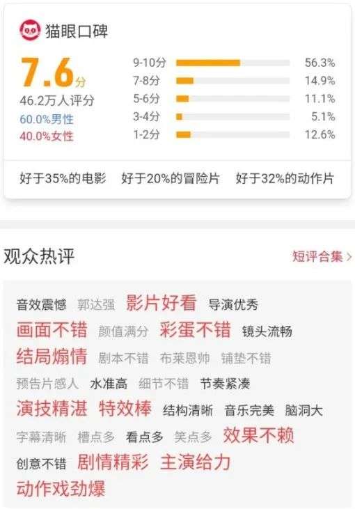 在豆瓣、影迷、媒体看衰之下,《速度与激情9》在猫眼电影购票评分上达到7.6的成绩,处于及格线以上的水准,在猫眼口碑分析给出的观众热评中,“演技精湛”、“动作戏劲爆”、“剧情精彩”等词成了标红重点。