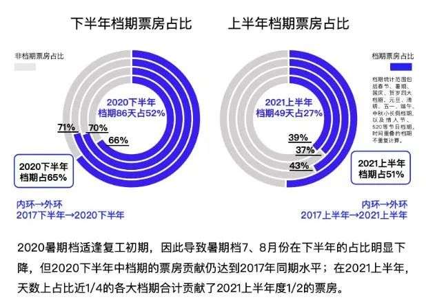 或是凭借头部项目与逆袭黑马,今年大部分档期依旧火热,但平日近乎冰冷的大盘却在提醒着我们,这场旷日持久的片荒,早已让市场陷入尴尬境地。根据猫眼研究院数据,2021年上半年,天数上占比近四分之一的档期贡献了上半年51%的票房占比,档期、非档期市场分化显著。
