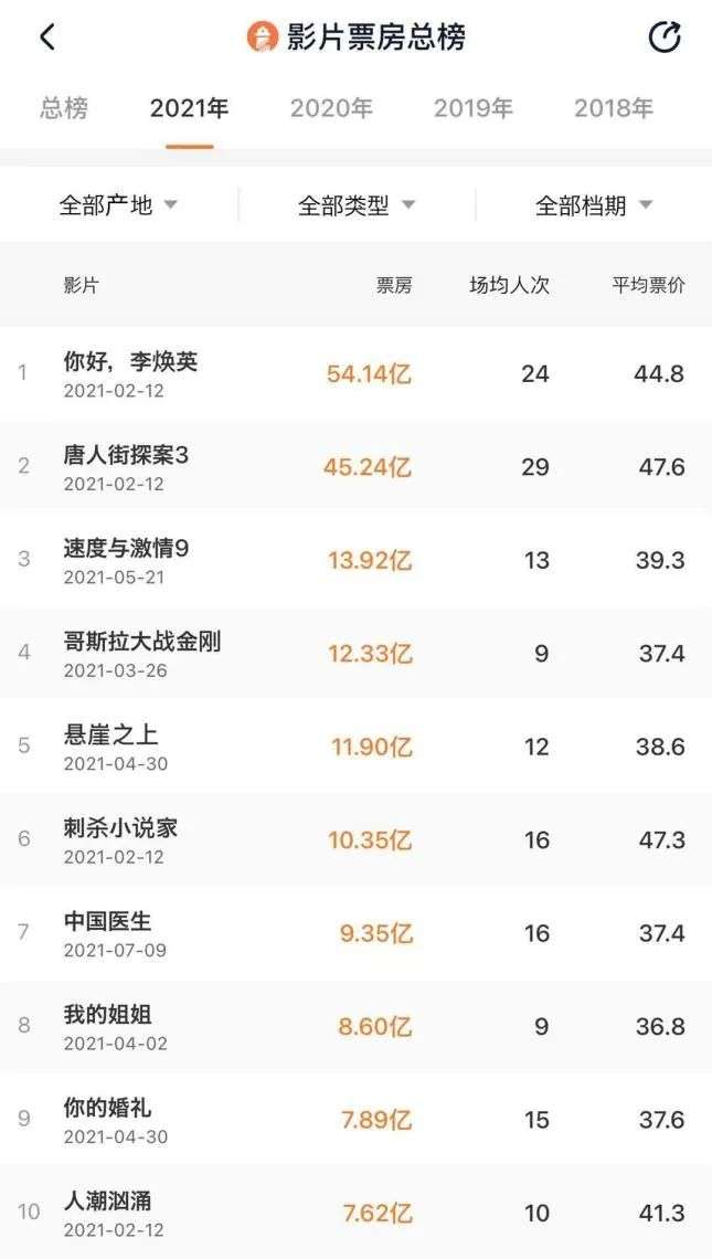 截至7月19日,2021年中国电影票房TOP10中有8部影片选择在档期上映,唯二打破档期定律的是《速度与激情9》《哥斯拉大战金刚》两部在非档期上映的好莱坞大片。