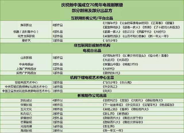 10年后的当下,推荐献礼的剧目翻了一番,达到86部; 卫视格局也发生翻天覆地的变化,央视+北京、浙江、东方、湖南、江苏构成新格局; 编播也从4+X进入到“一剧两星”时代外,剧集背后的出品方组成也大不一样,具有互联网背景的影视企业大量涌现,坐拥资金、资源、平台等优势的它们正在发挥着越来越不可忽视的作用。