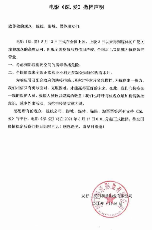另外,在中国电影行业“危急存亡之秋”,行业内依旧存在着大量的害群之马,例如上映仅仅三天就突发撤档的《深爱》。把较差的口碑与票房表现,甩锅给疫情,并且还把已经被行业摒弃了一年半的“影院对抗疫有害论”再搬出来扰乱视听。考虑到影片的投资者大概率来自于对电影行业不太了解的民间,这种宣传对电影行业造成的恶劣影响,或许比想象更大。