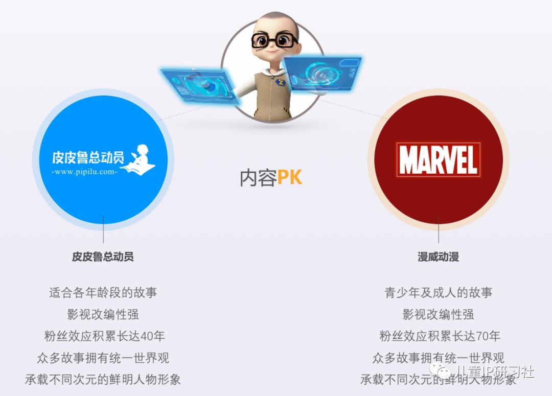 郑渊洁的儿子郑亚旗则更具野心,在皮皮鲁总动员公司介绍的首页上,赫然罗列着《皮皮鲁总动员》和《漫威动漫》的内容PK。可以看出,皮皮鲁总动员和漫威系列有很多共同点,比如各自的统一世界观,塑造了不同次元的鲜明人物形象,具有一定的粉丝效应积累。然而从年龄段来看,皮皮鲁总动员相比漫威系列更适合全年龄段的受众用户,市场潜力更加明显。