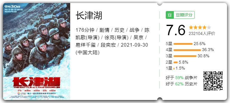 但相比于票房的一骑绝尘,《长津湖》在口碑方面并未取得与之相匹配的较高评价。豆瓣7.6中规中矩的评分及一些负面评价(超过8万人打了三星及以下),也暴露出这部电影在某些方面的不足,比如文戏部分较弱,人物深度不够,台词偏向说教等问题。