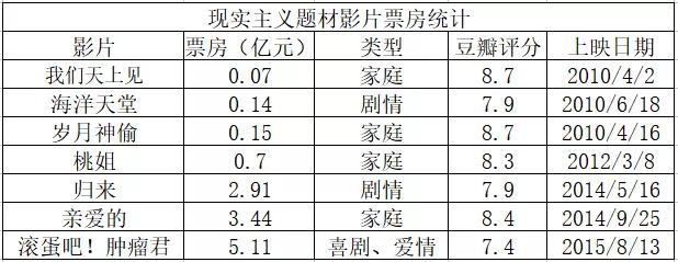 直到近几年《归来》《亲爱的》《滚蛋吧!肿瘤君》这类影片相继迈入票房亿元时代,现实主义题材电影才有了崛起之势。当然它们票房体量虽然有不小的突破,但与商业类型片的票房相比,巨大的差距也意味着属于现实主义题材电影的时代还远未到来。
