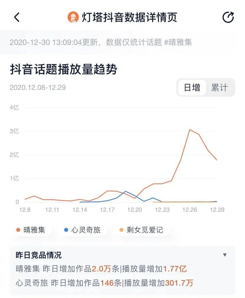 点开“官抖榜”和“话题榜”中的《晴雅集》,都可以进入该部影片的灯塔抖音数据详情页。在这个页面,除了昨日的话题播放量、官抖获赞数和官抖粉丝数,还能够看到这部电影的抖音话题播放量的趋势曲线。