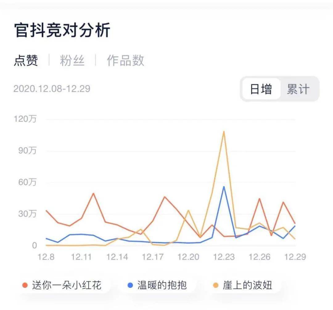 可以发现,在“抖音电影榜”里,片方不仅可以获得自己影片的数据信息,也能看得到竞品营销动作的表现,通过对比功能找到自己与竞对的竞争差异和优劣势。比如《温暖的抱抱》和《小红花》作为贺岁档种子选手,了解对方的营销物料在短视频平台的表现后,可以及时调整后续物料的发布动作,从而把抖音营销的作用发挥到最大。