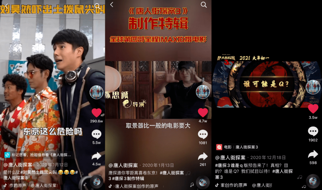全程IMAX拍摄、去“推理之都”东京取景、邀请人气日星出演、网剧版《唐探》助推......《唐探3》在抖音的宣发可谓多点开花,制作升级和日本元素是两大卖点。