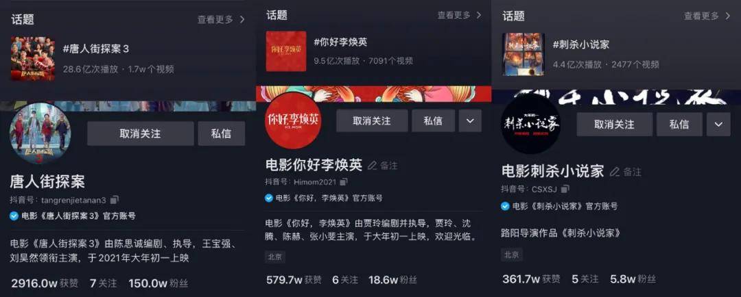 其中,《唐探3》话题下产出了1.7w个视频,共28.6亿次播放量;第二名的《你好,李焕英》话题下共有7067个视频,共9.5亿次播放;《刺杀小说家》话题页也有2467个视频,共4.4亿次播放。可见,三部片的短视频营销已初见成效,并悄然形成了一组“春节档营销三强领跑团”。
