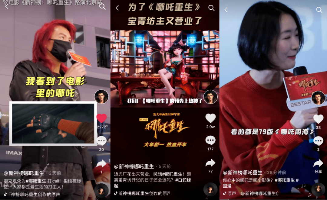 《哪吒重生》是2021春节营销真正意义上的“抢跑者”。近期,该片已在北京开启路演场,一些观众映后发言视频被片方搬上抖音,在口碑营销上占了先机。