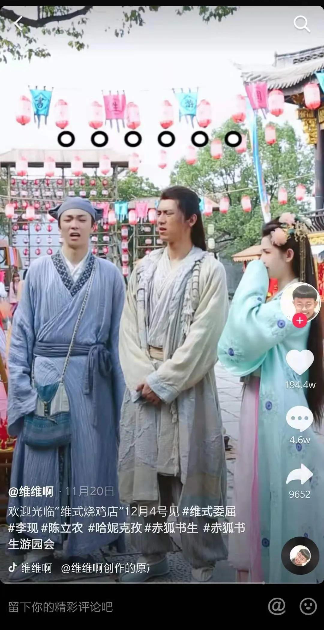 《赤狐书生》并不是这种玩法的首创者,此前在@七阿姨 这个账号开始就已有苗头。@七阿姨 是一位在抖音有2600万+粉丝的电影内容创作者,其内容特色是在路演现场,用土味情话撩主演,短平快的节奏和幽默的对白使其视频迅速爆红。这开启了抖音主创进驻影片官方,互动共创的模式,《赤狐书生》的宣发玩法是在这基础上的进阶版本。