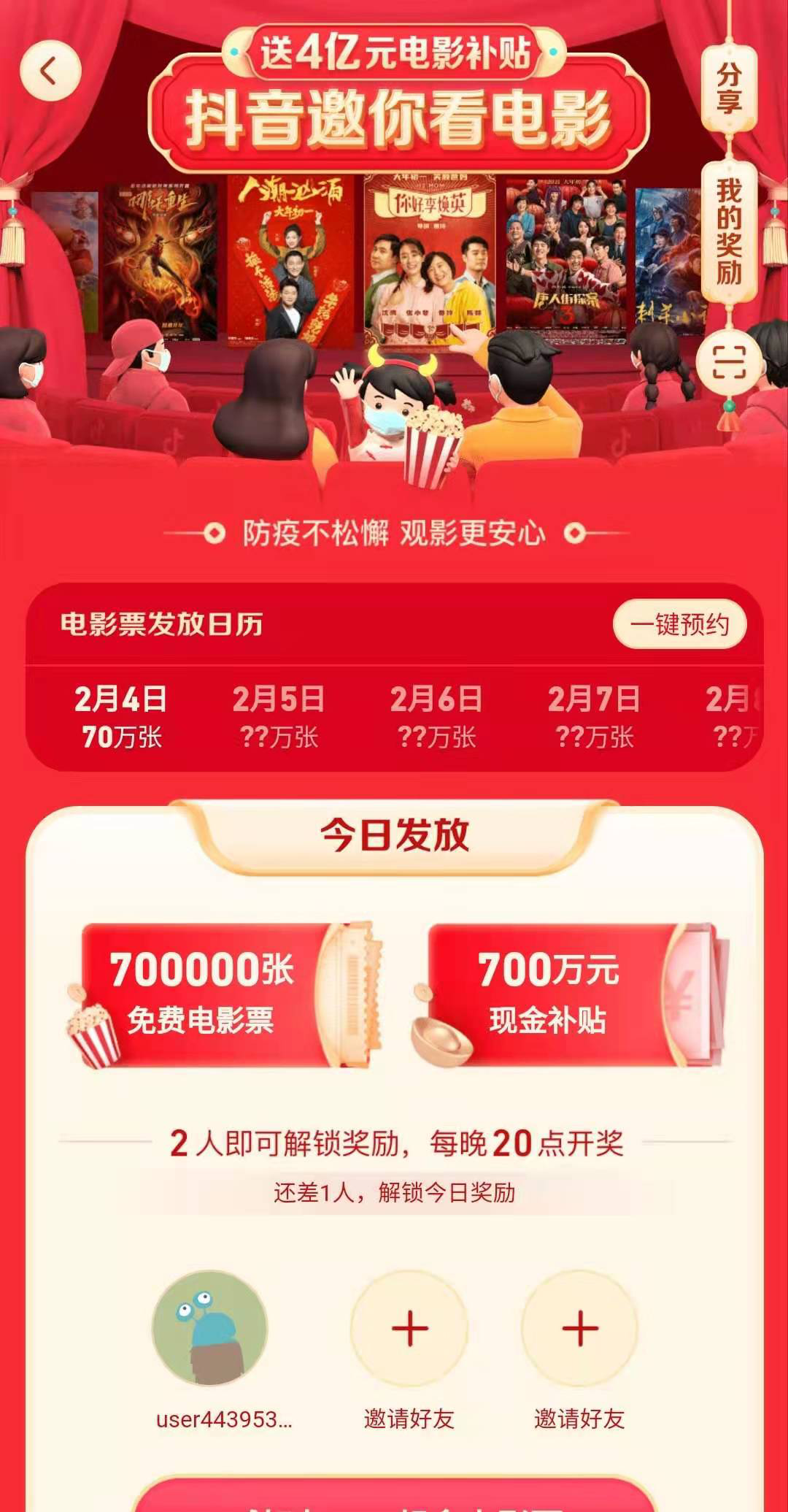 伴随内容的热烈讨论的,还有抖音与春节档7部影片合作的线上活动“抖音邀您看电影”。在抖音搜索“电影票”进入活动专区,邀请亲朋好友组队,就有机会分得4亿电影福利。