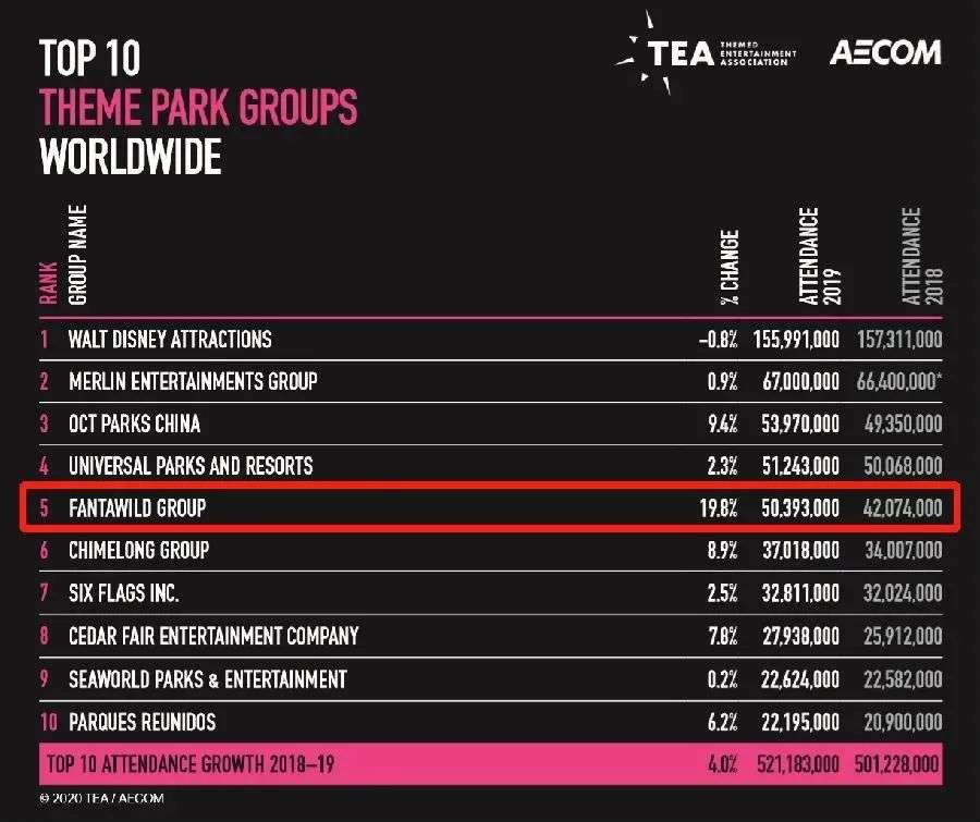为了让技术和设备价值最大化,华强方特于2007年开始发力主题乐园业务。2018年,华强方特已推出了超过20个主题乐园,根据主题娱乐协会(TEA)与美国AECOM集团联合发布的《2019年主题乐园报告》,全球游客量前十名的主题公园集团中,华强方特排名第五。
