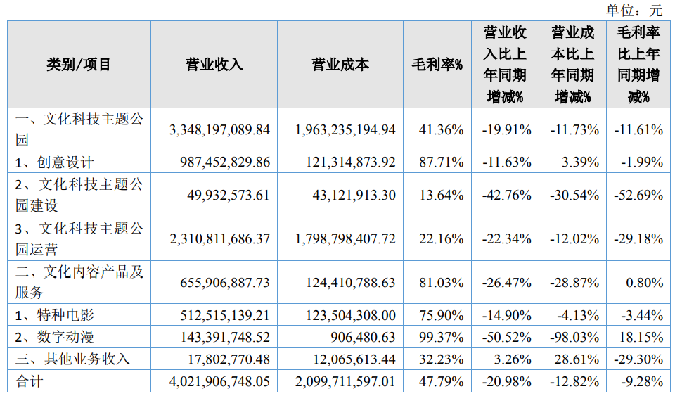 根据华强方特2020年财报,营收同比下降 20.98%;净利润为5.28亿元,同比下降35.17%。其中,主题公园建设、主题公园运营、数字动漫三个业务的营收分别下降了42.76%、22.34%、50.52%,受影响最大。