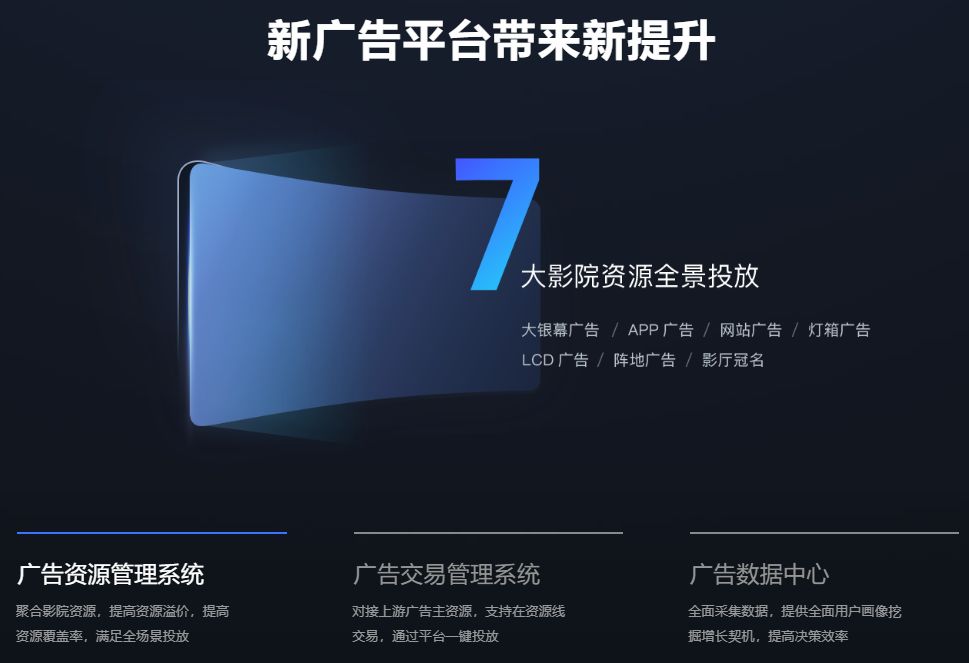 在面向B端的营收中,广告是影院利润率最高的一块业务。影院广告在过去几年中不断高涨,收入在2018年达到了50亿元,但今年影院的广告市场并不乐观。对于影院来说,广告播控无法全自动化、缺乏客观数据监控等,都是影院广告方面亟待突破的点。新辰星推出的广告平台则尝试全面打通广告商和影院方,为二者提供类似电商的交易平台,同时也为影院提供详细的广告资源管理系统和数据系统,从两方面让影院广告业务更加智能化。