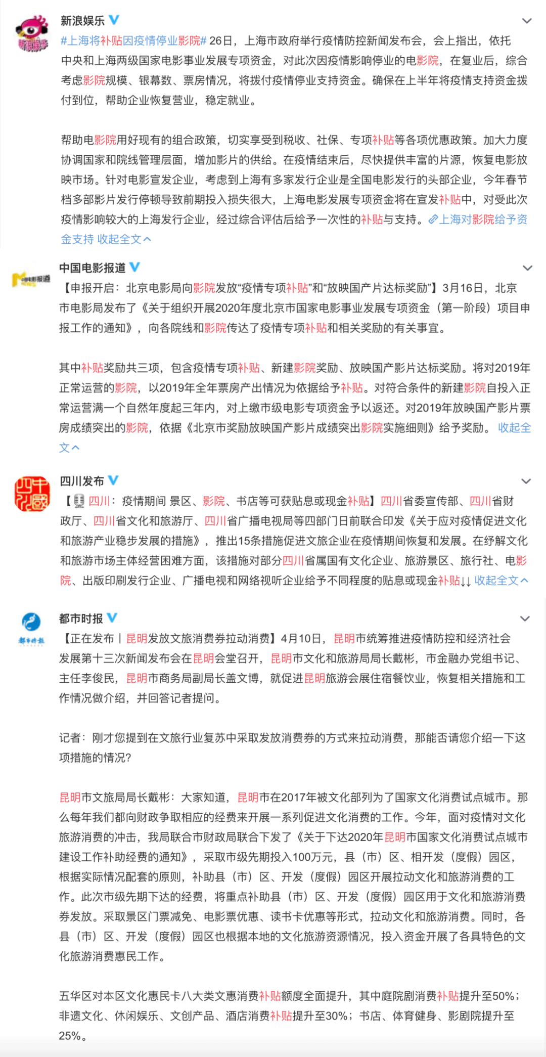 看向国内,在前阵子短暂的影院复工潮当中,如北京、上海、四川、昆明等多地政府也发布相关文件,表示对于文化、旅游相关产业提供资金补贴。