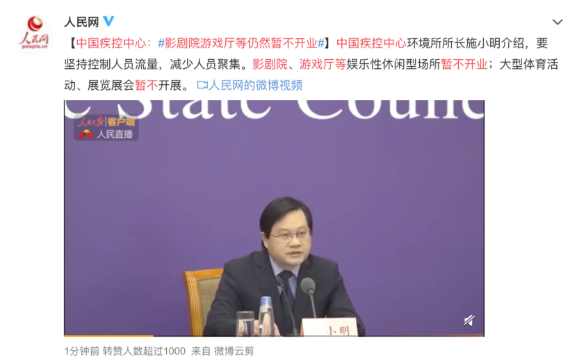 在今天下午国务院联防联控机制新闻发布会上,中国疾控中心环境所领导在介绍降低新冠肺炎感染风险的策略时,再次强调“对于影剧院或者是游戏厅等娱乐性或者是休闲性场所应暂不开业”。由此可以看到,在依然把关严格的防控工作下,电影院依然开门无望。