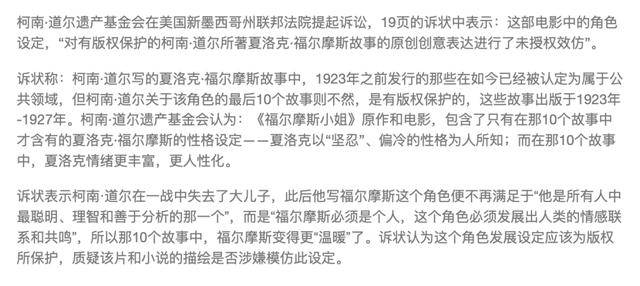 从诉状内容来看,基金会的主要意思是:那个坚韧、冷静的福尔摩斯已经公版了,可以随意改编,但是那个有人情味的福尔摩斯我们还是拥有版权的,你随意改编就是乱编,是要负责任的。