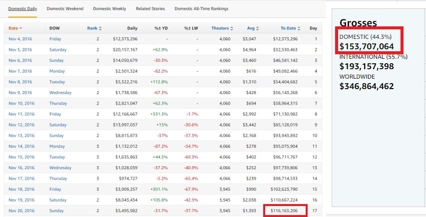 以上图为例,该影片在北美市场上映17天的票房合计在1.16亿美元,而最终在北美市场的总票房为1.53亿美元,占比达到了75.6%。而该影片的上映影院数从最开始超过4000家,在上映第20天减至3000多家。