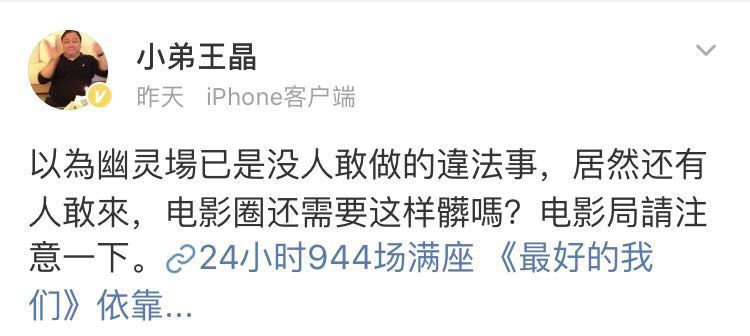 而在票房缺口之下,电影市场也并不算安稳。昨日有媒体爆出《最好的我们》存在“幽灵场”现象,24小时内全国900多场次上座率达到100%,其中部分场次在22时到次日10时的冷门观影时间。消息爆出后,《追龙2》导演王晶发布微博怒斥幽灵场,一个小时后《最好的我们》电影官方微博发布回应,否认上座率造假等问题。事件发酵,让公众的目光再次聚焦到电影产业的灰色地带。