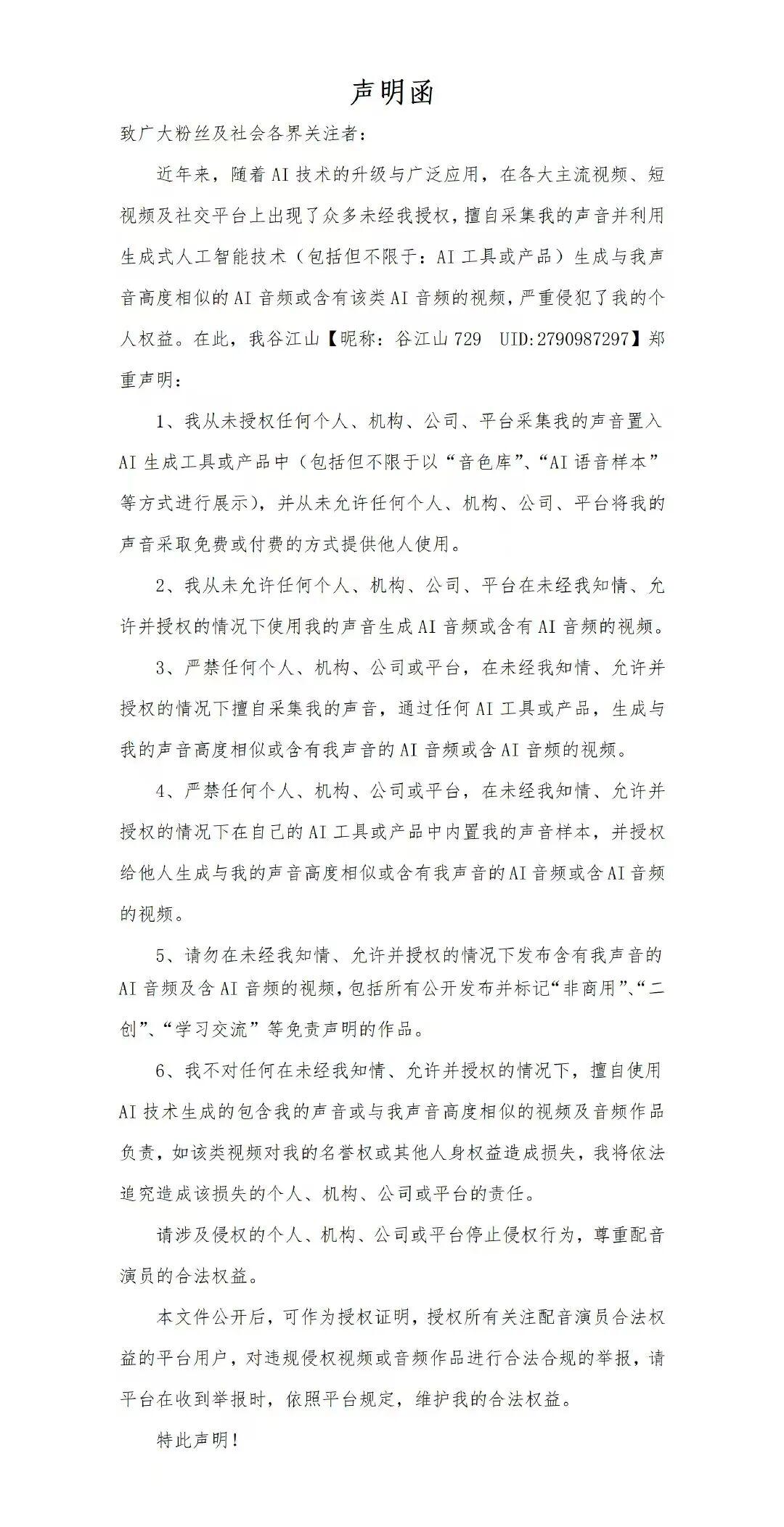△多名配音演员相继公开发声,反对未经演员知情同意,擅自采集其声音素材用于AI训练、音色合成及商业变现的行为。