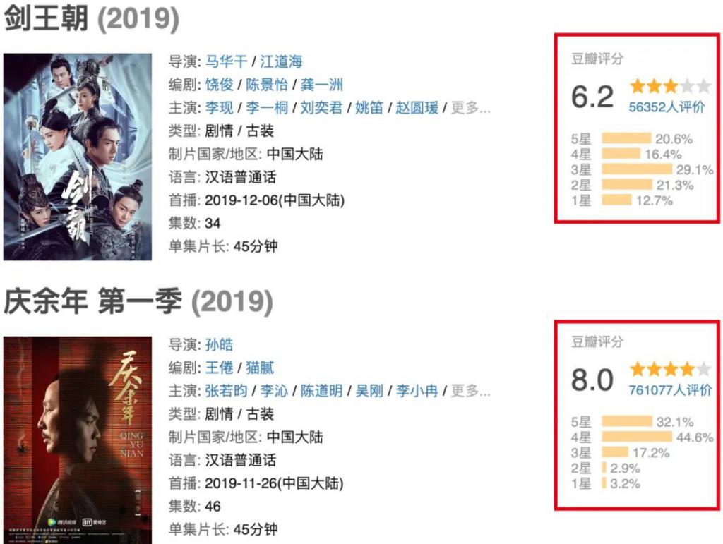 由此,《剑王朝》预期质量可以对标同档期的《庆余年》。冯氏喜剧、美术设计、" 夜宴 " 风格等元素也成为关注焦点。可《剑王朝》自首播两天后,不仅热度收视垫底,豆瓣评分跌至 6.2 分,与爆款《庆余年》形成鲜明对比。