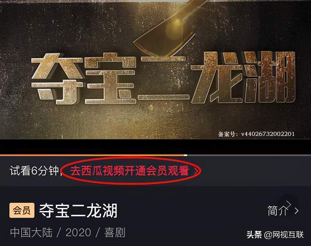 10月份西瓜视频上线的《夺宝二龙湖》,选择了网络电影普遍的付费播出模式,即前6分钟免费观看,6分钟以后须开通会员观看。