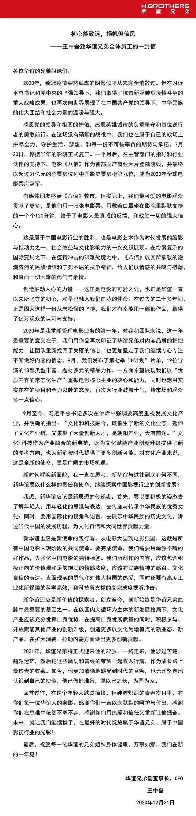 王中磊在信中表示,这一年最重要的意义在于,我们用作品再次印证了华谊兄弟对内容品质的把控能力,让团队重新找回了失落已久的信心,也更加坚定了我们继续专心专注不断做好内容的信念。