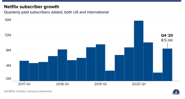 第二是去年第四季度新增会员数850万,远高于华尔街的600万预期数字。截止2020年底,Netflix共有2.04亿付费用户,首次突破2亿大关,同比增长21.9%;全年净增长3660万新用户,是其有史以来新增用户数最多的一年。
