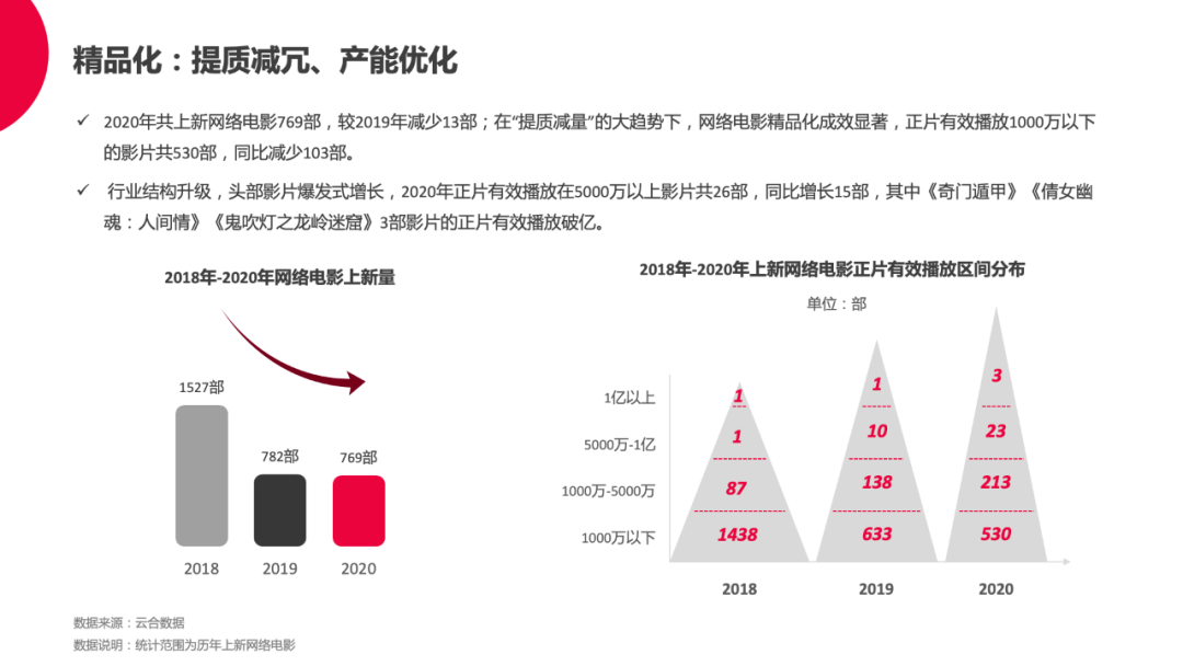 显然,“分账票房翻倍增长”、“提质减量”、“商业模式创新”等字眼成为了2020年网络电影行业的年度关键词,整个行业实现的发展进步是值得肯定的。
