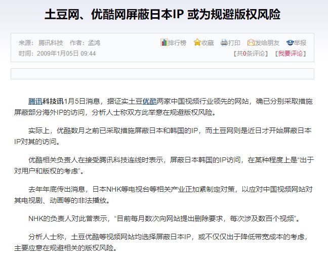 这让本来就深陷版权问题的土豆一时间找不找北,除了着急忙慌地删视频之外,对于最大的侵权来源日本也只能封 IP 了事。