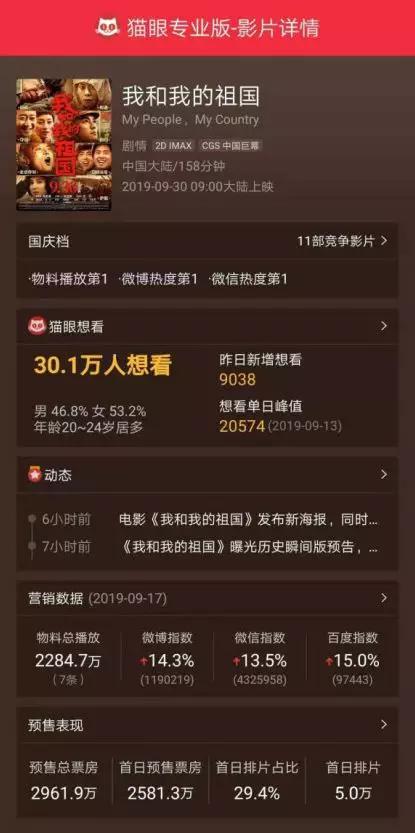 猫眼数据显示,国庆档11部新片中,《我和我的祖国》热度第一,微博微信以及物料播放都排名第一。30.1万人想看该片,其中年龄段20—24岁居多,目前预售总票房2961.9万,首日预售票房2581.3万。