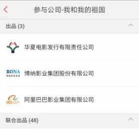 与此同时,联合出品方阵容华丽,光线传媒(8.480, -0.01, -0.12%)、猫眼娱乐、人民网(23.980,-0.02, -0.08%),华谊兄弟(4.540, -0.01, -0.22%)也是《我和我的祖国》的联合发行方。此外,华策影业,腾讯影业,横店影视(15.420, -0.03, -0.19%),万达影视,新丽传媒,英皇影业,华侨城集团,上影集团等均有参与。