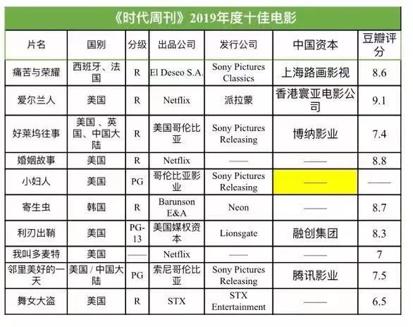 由《时代周刊》评选出的十佳影片中,除却西班牙影片《痛苦与荣耀》和韩国影片《寄生虫》两部非美国主出品电影外,其余8部影片中仅昆汀·塔伦蒂诺的《好莱坞往事》、吉莉安·阿姆斯特朗的《小妇人》和丽埃尔·海勒的《邻里美好的一天》3部影片是由传统好莱坞“五大”中的哥伦比亚影业公司主出品,其它影片皆与传统好莱坞“五大”无关。