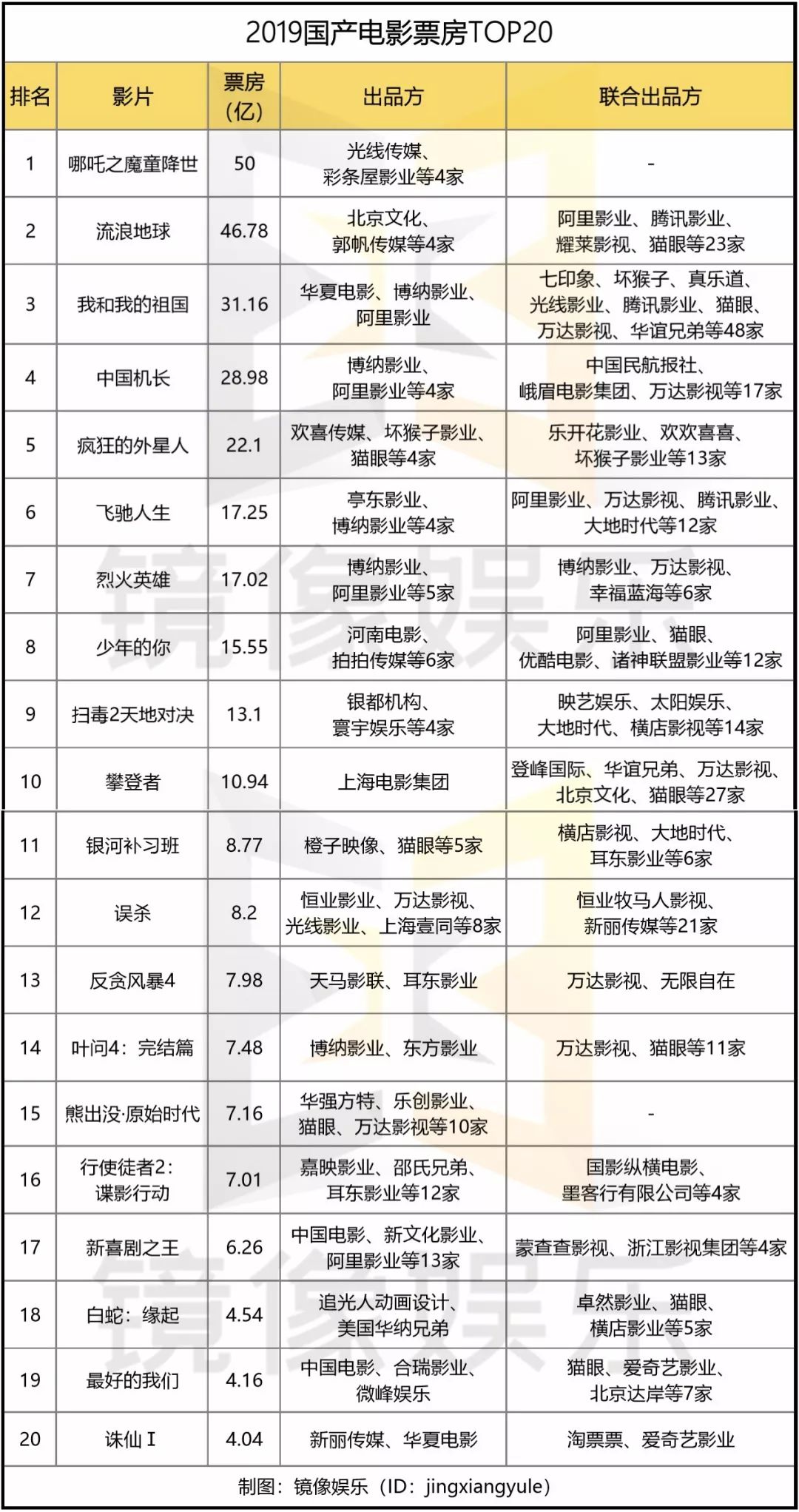 除了五大民营公司,整个电影行业的洗牌之势更加猛烈。2019年超过1800家影视公司倒闭,不少电影公司处境自然也不乐观,如中南文化、印纪传媒等皆自顾不暇,票房TOP20作品中更是未见身影。2019年,有优质内容傍身的公司开始逐渐上行,而成绩不佳的,还需继续等待机会。