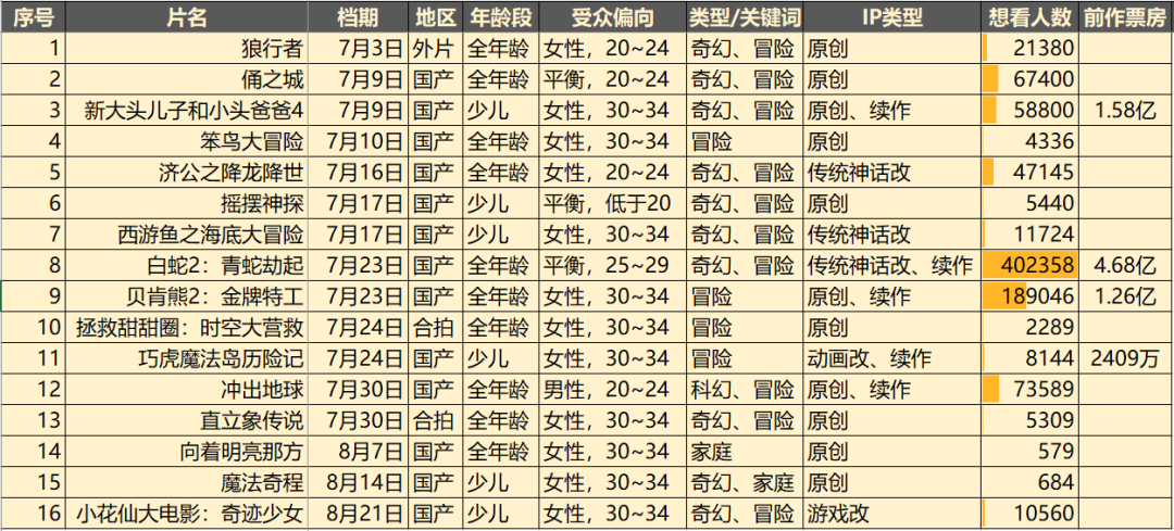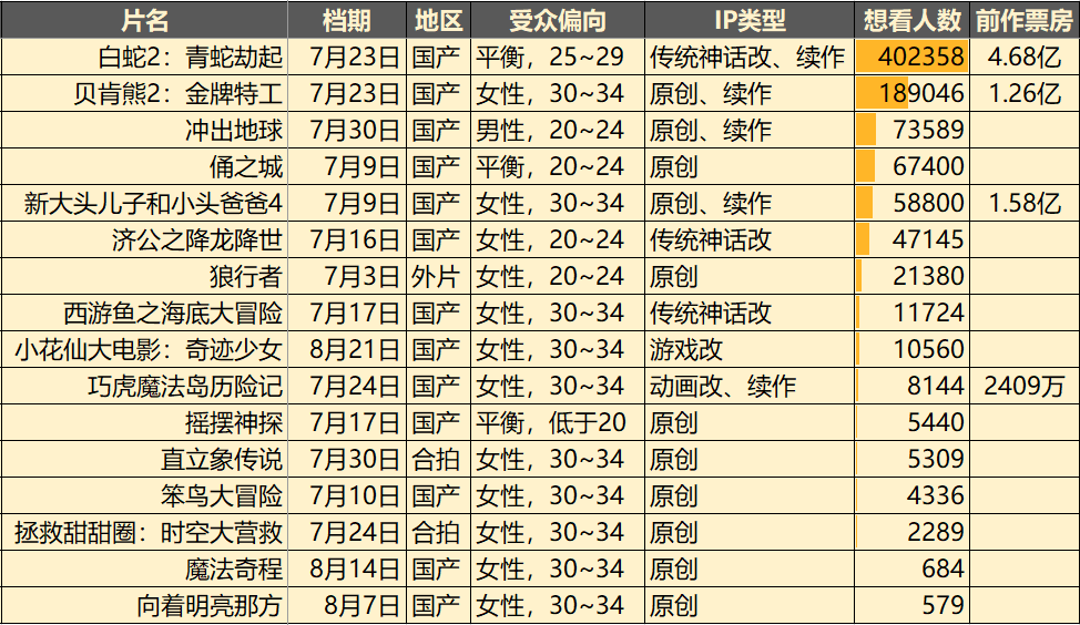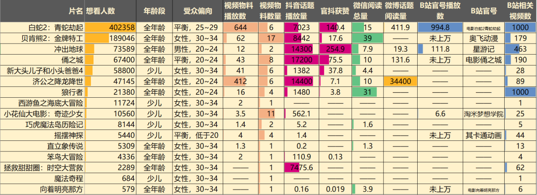综合数据比较突出的,《白蛇2》、《冲出地球》、《贝肯熊2》、《俑之城》,也可以看看最终的成绩是否是他们最高。