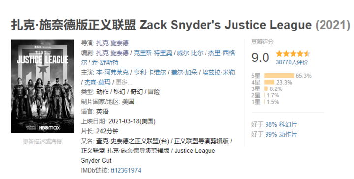 截至发稿前,扎剪版《正义联盟》的豆瓣评分达到 9.0 分,是仅次于诺兰导演的《黑暗骑士》(9.2 分)的超级英雄电影,而 iMDb 的评分也是高达 8.7 分,「几乎可以」名垂影史。