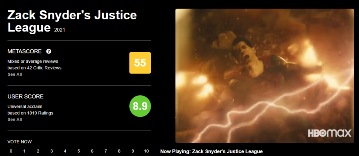 扎剪版《正义联盟》的评价出现了两极分化严重的现象,在 Metacritic 收集的媒体评分中,平均分只有 55 分。