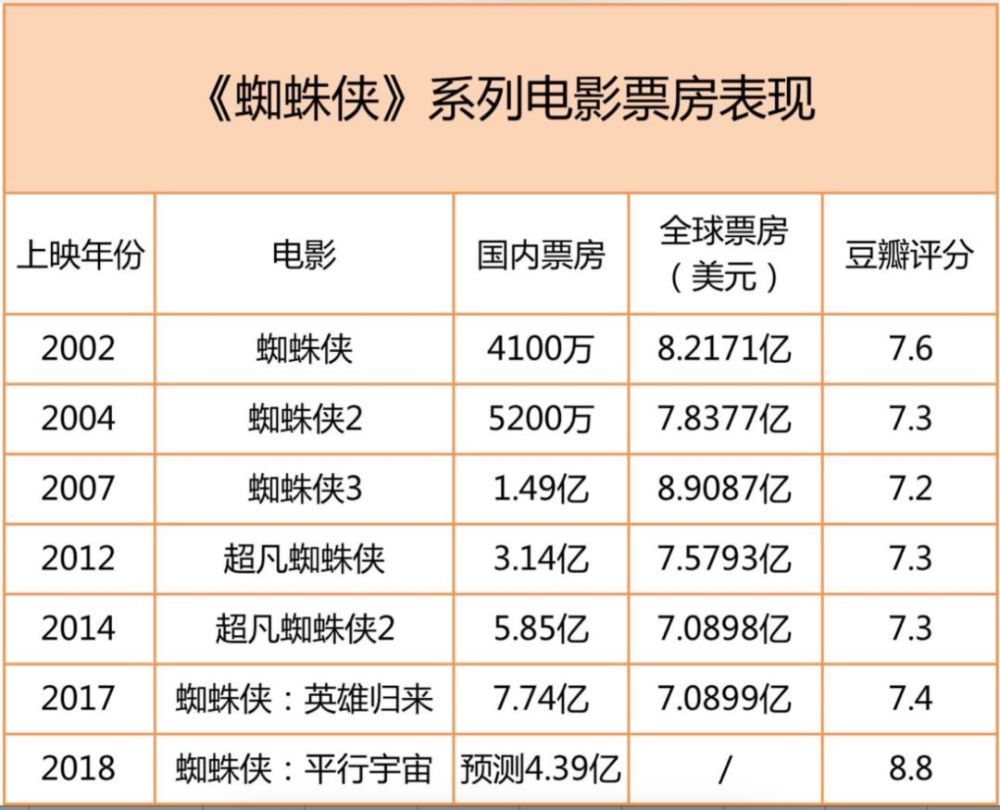 于2007年在国内上映《蜘蛛侠3》的虽然获得了8.908亿美元的票房,但该片却遭到了媒体和影迷的猛烈批评。与此同时,尽管《蜘蛛侠3》比系列首部作品票房高出了近7000万美元,但时隔5年,两部影片的投资成本已不可同日而语。