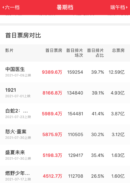 截至日前,2021年暑期档票房排名前十的电影为《中国机长》《1921》《白蛇2》《怒火重案》《盛夏未来》,其中博纳影业的《中国医生》12.56亿元,这是目前暑期档唯一一部票房过10亿元的影片。